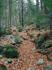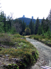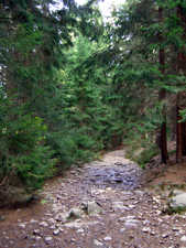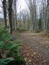An der Kreuzung des Gläsernen Steiges biegt man rechts ab. Auf einem idyllischen, aber recht unebenen Waldpfad beginnt nun der anstrengende Teil der Wanderung: stetig bergauf auf einem Waldpfad und anschließend auf breiten Wegen hinauf zur Großen Arber-Ebene.