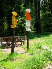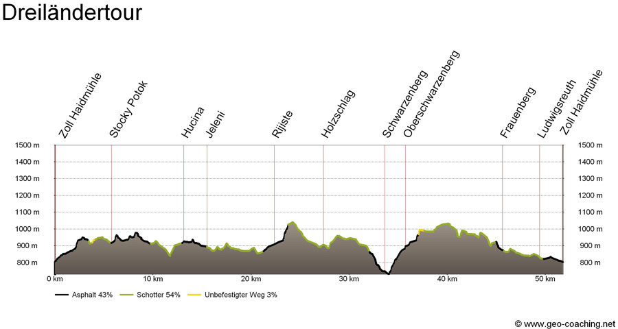 Einmal quer durch Europa? Nein, natürlich nicht! Aber auf einer Tour gleich drei Länder miteinander zu verbinden hat schon etwas Außergewöhnliches an sich! Diese Einmaligkeit durch den Bayerischen Wald, dem tschechischen Böhmerwald zu radeln und dann auch noch ins österreichische Mühlviertel zu schnuppern, gibt dieser Tour ein besonderes Flair. Ausgangspunkt ist der Grenzübergang in Haidmühle. Von dort radeln wir bergan bis wir an den Schwarzenberger Schwemmkanal ankommen und dieser wunderschönen, ebenen Strecke über 15 km weit folgen. Der Belag fein, die Wälder imposant und die Beanspruchung unserer Muskulatur nur mäßig: Ein wahrer Genuss für jeden Radler, der die Natur gleichzeitig bestaunen und regelrecht "erfahren" will. Wer sich ein weiteres Highlight gönnen will, der biegt in Hucina nicht nach links weiter entlang des Schwemmkanales ab, sondern strampelt 3,5 km nach rechts bergauf zum Plöckensteinsee: anstrengend aber eine Naturschönheit sonders gleichen! Die Tour führt weiter nach Jeleni. Dort bestaunen wir das imposante Tunnelportal und halten uns weiter entlang des Schwemmkanales. Nach knapp 23 km haben wir aber nun den schwersten Teil der Tour vor uns: Hoch hinauf geht es nun zum Grenzübergang Rossbach und oben auf der Kuppe angekommen, überqueren wir an einer kleinen Blockhütte die Grenze zwischen Tschechien und Österreich. Immer noch durch die grandiose Waldlandschaft gelangen wir zur Talstation des Skigebietes Hochficht. Dort nochmals nach rechts bergan und dann weiter auf der Schotterstrecke bis zur Asphaltstraße oberhalb von Schwarzenberg. So gerne wir die Abfahrt in einem Braus nehmen möchten, so sehr fasziniert uns aber auch die wunderschöne Fernsicht in das weite Mühlviertel, zur Donauebene und bei Föhn bis in die Alpen, die dann zum Greifen nahe erscheinen. Also: Zeit lassen, bremsen und genießen. In Schwarzenberg kehren wir am besten zuerst einmal gemütlich im Hotel "Adalbert-Stifter-Hof" direkt an der Hauptstraße ein. Der Topfenstrudel hier ist nämlich ein Gedicht und wir haben uns diesen Zwischenstopp redlich verdient! Die Pause tut uns sichtlich gut, denn bereits nach knapp 500 Metern sind letztmals unsere strammen Wadeln gefordert. Hinauf nach Oberschwarzenberg, immer der Beschilderung Nr. 53 folgend, überwinden wir nochmals ca. 150 Höhenmeter auf den nächsten 2 km. Aber auch hier sollten wir es nicht versäumen und den Blick zurück auf das beeindruckende Panorama werfen. Die Grenze nach Bayern, überqueren wir bei einem schmalen Grenzbach der den bezeichnenden Namen "Furth" (im Sinne einer Überfahrt) trägt. Die nächsten 11 km tragen den Namen "alte und neue Ewigkeitsstraße" - ein langatmiger, aber immer eben oder leicht bergab führender Streckenabschnitt. Ein aussichtsreicher und nicht sehr bekannter Punkt liegt nur 300 Meter abseits dieses Schotterstrecke: Der Klausgupf - unbedingt sehenswert! In Frauenberg angekommen halten wir uns an der Staatsstraße kurz nach links um bei der nächsten Gelegenheit in den Adalbert-Stifter Geh- und Radweg nach rechts einzubiegen. Knapp 52 km haben wir letztendlich in den Beinen, wenn wir mit traumhaften Ausblicken, imposanten Anblicken und voller neuer Eindrücke aus drei Ländern wieder in Haidmühle ankommen.
