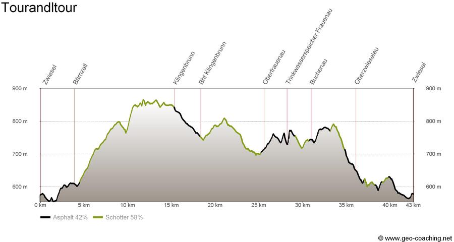 Die Tour beginnt am Bahnhof in Zwiesel gegen den Uhrzeigersinn und führt Richtung Süden durch den Ort. Nach dem Kreisverkehr überquert man den Schwarzen Regen und die B11, bis das Naturparkhaus (Infozentrum) erreicht wird. Es bietet eine Fülle an Informationen und ist allein schon durch die moderne Architektur einen kurzen Stopp wert. Durch Wiesen gelangt man nach Bärnzell. Danach steht ein langer Anstieg durch den Wald hinauf nach Klingenbrunn bevor. An den Taferlhängen und dem Dreikögelriegel vorbei, Richtung Wagensonnriegel fahren. Nach diesem Anstieg von immerhin knapp 300 Höhenmetern kann man sich auf dem folgenden, fast ebenen, Wegstück bis nach Klingenbrunn erholen. Bis zum Klingenbrunner Bahnhof geht es zunächst gemütlich bergab, bevor die Spiegelstraße wieder bergwärts zur Altposchingerhütte führt. Anschließend wird man mit einem Downhill bis nach Oberfrauenau belohnt. Es folgt ein kleiner Anstieg bis zur Dammkrone der Trinkwassertalsperre Frauenau mit tollen Ausblicken ins Nationalparkgebiet. An der Dammkrone entlang führt die Tour hinunter nach Buchenau. Ein letztes Mal bergauf geht es auf Asphalt nach Jungmaierhütte. Über schöne Panoramawege erreicht man Ober- und Unterzwieselau. Das letzte Stück der Tour verläuft auf dem Radweg an der B11 nach Zwiesel.