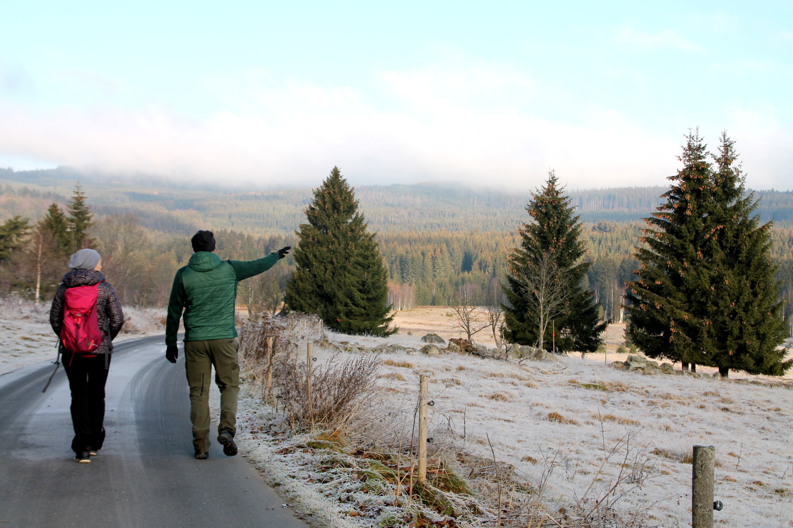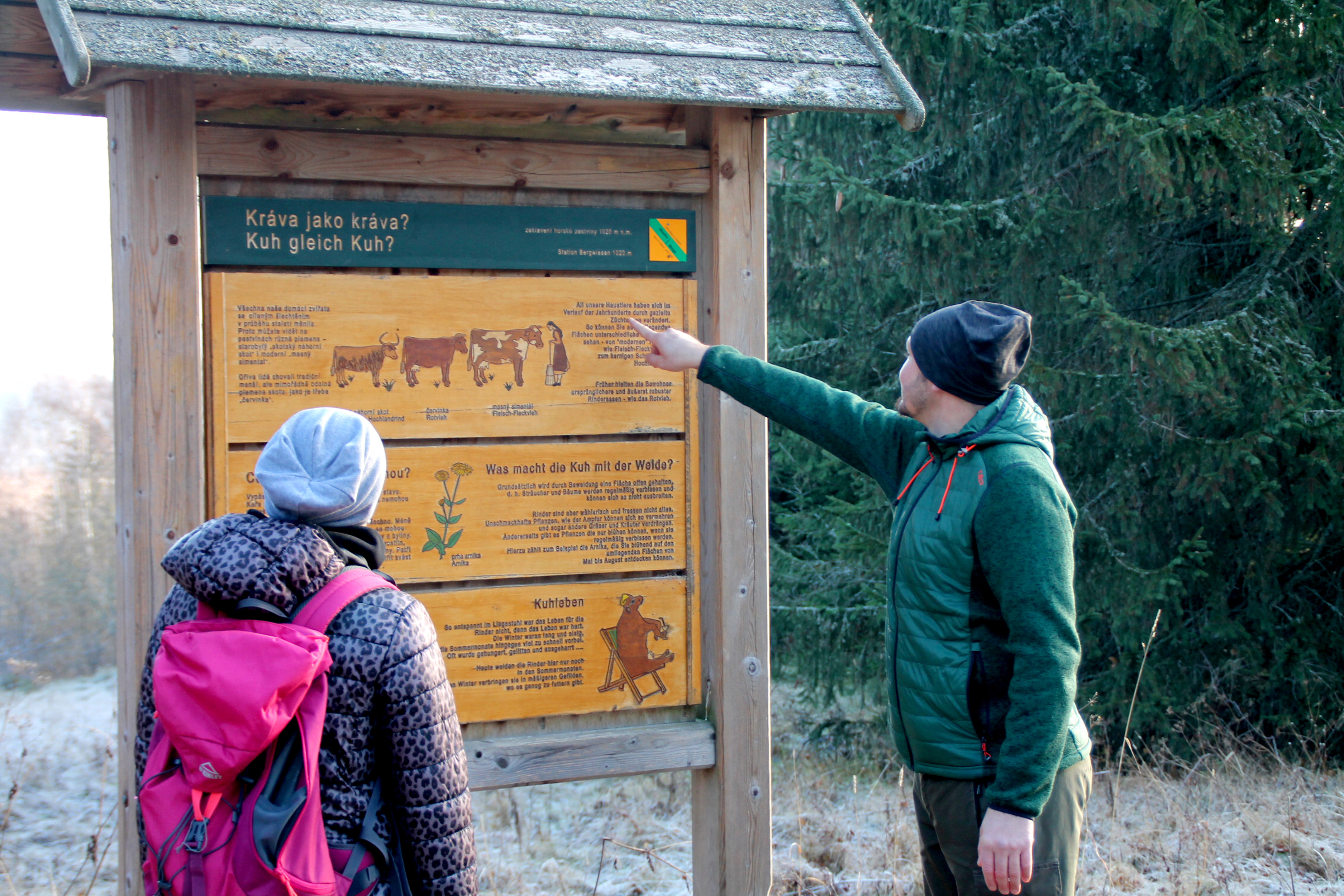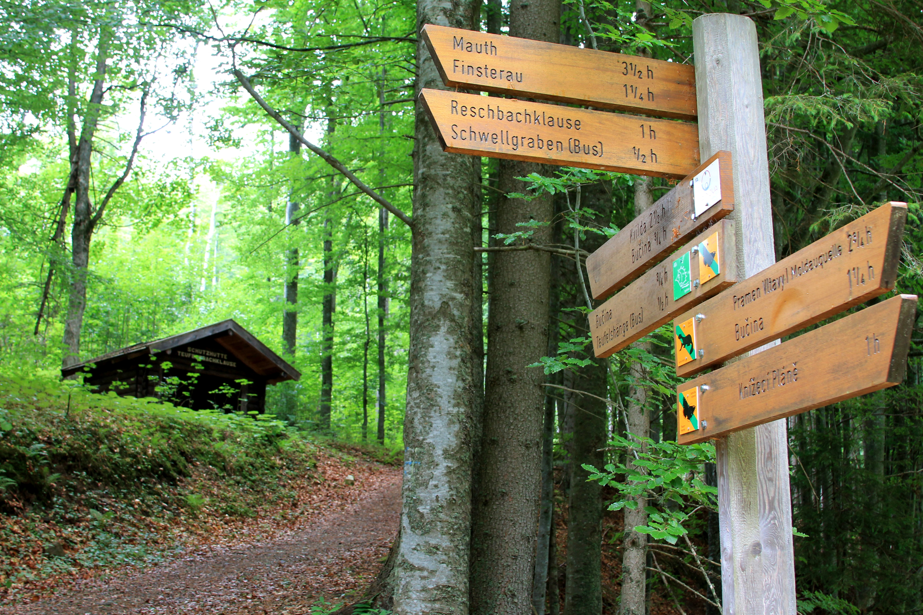 Hinweis: Bitte Ausweis auf der grenzüberschreitende Tour mitführen!Markierungszeichen: TrauermantelStart/Ziel: Landesgrenze Finsterau-BučinaDer Trauermantel-Weg ist mehr als nur eine Wanderung – er ist eine Zeitreise durch Natur und Geschichte. Die Rundtour startet am Grenzübergang Finsterau–Bučina und führt dich auf gut begehbaren Wald- und Wiesenwegen über die Grenze nach Tschechien. Mit rund 10 Kilometern Länge, sanften Anstiegen und gut markierten Wegen ist der Trauermantel-Weg ideal für alle, die Natur mit Tiefgang suchen. Und nicht vergessen: Ausweis mitnehmen, denn du überquerst die Grenze!Die Besonderheit des Weges liegt in seiner stillen Dramatik: Wo früher Menschen lebten, herrscht heute Natur. Lesesteinwälle, alte Wege und verfallene Mauern erzählen vom Verschwinden ganzer Dörfer nach dem Zweiten Weltkrieg. In den vom Menschen geprägten Flächen siedelten sich Tiere und Pflanzen an, die in der natürlichen Waldlandschaft keinen Platz hatten - wie Trauermantel und Arnika.Entlang des Weges begleiten sechs Stationen und geben interessante Einblicke:Auf dem WegStein um Stein, Jahr um JahrKuh gleich Kuh?Es war einmal in Dorf...Im WaldTeufelswerkDer Rückweg führt dich über die Teufelsbachklause zurück nach Deutschland – ein stiller Ort mit viel Symbolkraft.Barrierearmut/-freiheitKinderwagen - Ab Fürstenhuter Friedhof muss wieder der gleiche Rückweg genommen werden.Rollstuhl - Aufgrund der Länge und Höhenmeter ungeeignet bzw. wenn dann nur für Elektrorollstühle. Ab Fürstenhut muss wieder der gleiche Rückweg genommen werden.Rollator - Aufgrund der Länge für Rollator ungeeignet.InfrastrukturParkplatz (gebührenpflichtig): Ski- und Sportzentrum Finsterau oder WistlbergHaltestelle: Finsterau, Teufelshäng (Landesgrenze)WC: LandesgrenzeEinkehrmöglichkeiten (Öffnungszeiten beachten)Alpenfernsicht in Bučina (CZ)Hegerhaus in Fürstenhut (CZ)Café Wistlberg in Finsterau - 3,5 km EntfernungLandhotel Bärnriegel in Finsterau - 4,5 km Entfernung