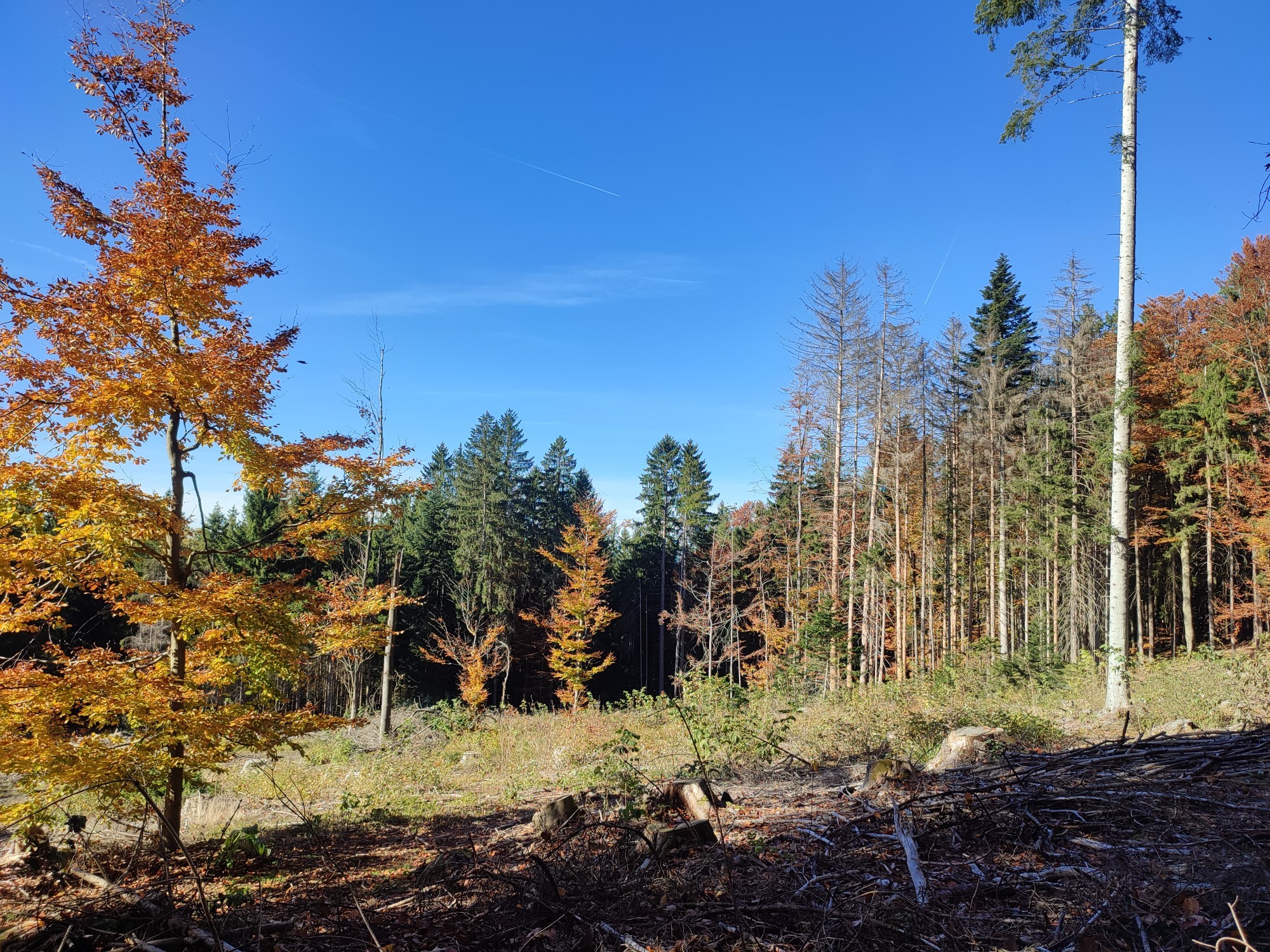 Ausblick. Nun wird ein weitläufiges Waldgebiet betreten, in dem Sie in einem gemächlich ansteigenden Waldweg, mit verschiedenen Themenstationen, zur Rodungsinsel Kohlstatt gelangen. Dort überquert man die Straße und erklettert
