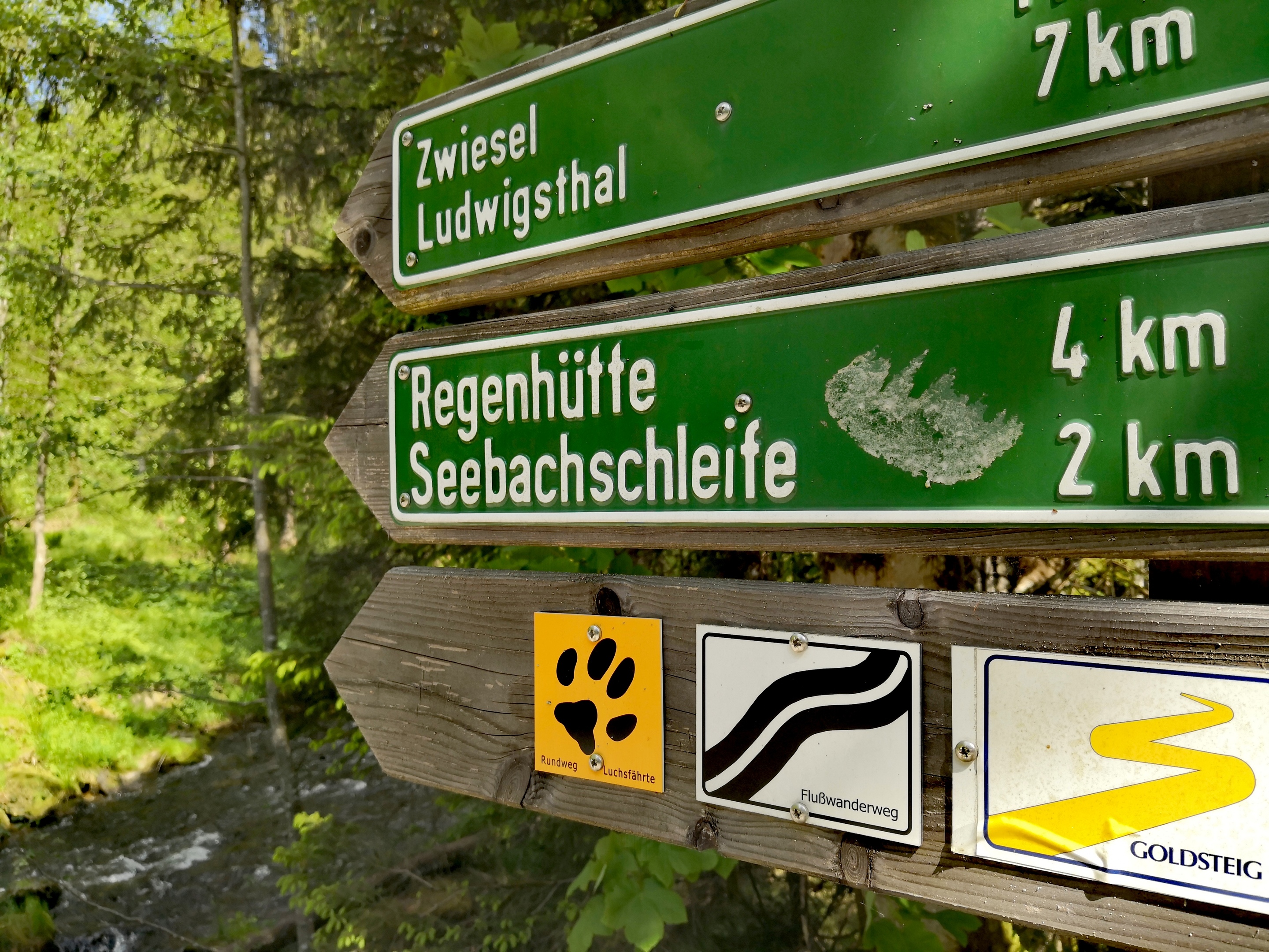Bei der darauffolgenden Brücke wechseln Sie dann erneut die Flussseite. Weiter geht es, vorbei an einem kleinen Wehr mit Wasserrad, entlang eines weiteren Kanals nach Seebachschleife (ein ehemaliger Glashüttenort). Hier wechseln Sie wieder die Seite des Flusses bis Regenhütte. Nach einigen kleinen Auen verlassen Sie kurz vor Ludwigsthal dann den Flusswanderweg und folgen der Markierung "Luchspfote" weiter zum Nationalparkzentrum Falkenstein mit Haus zur Wildnis.