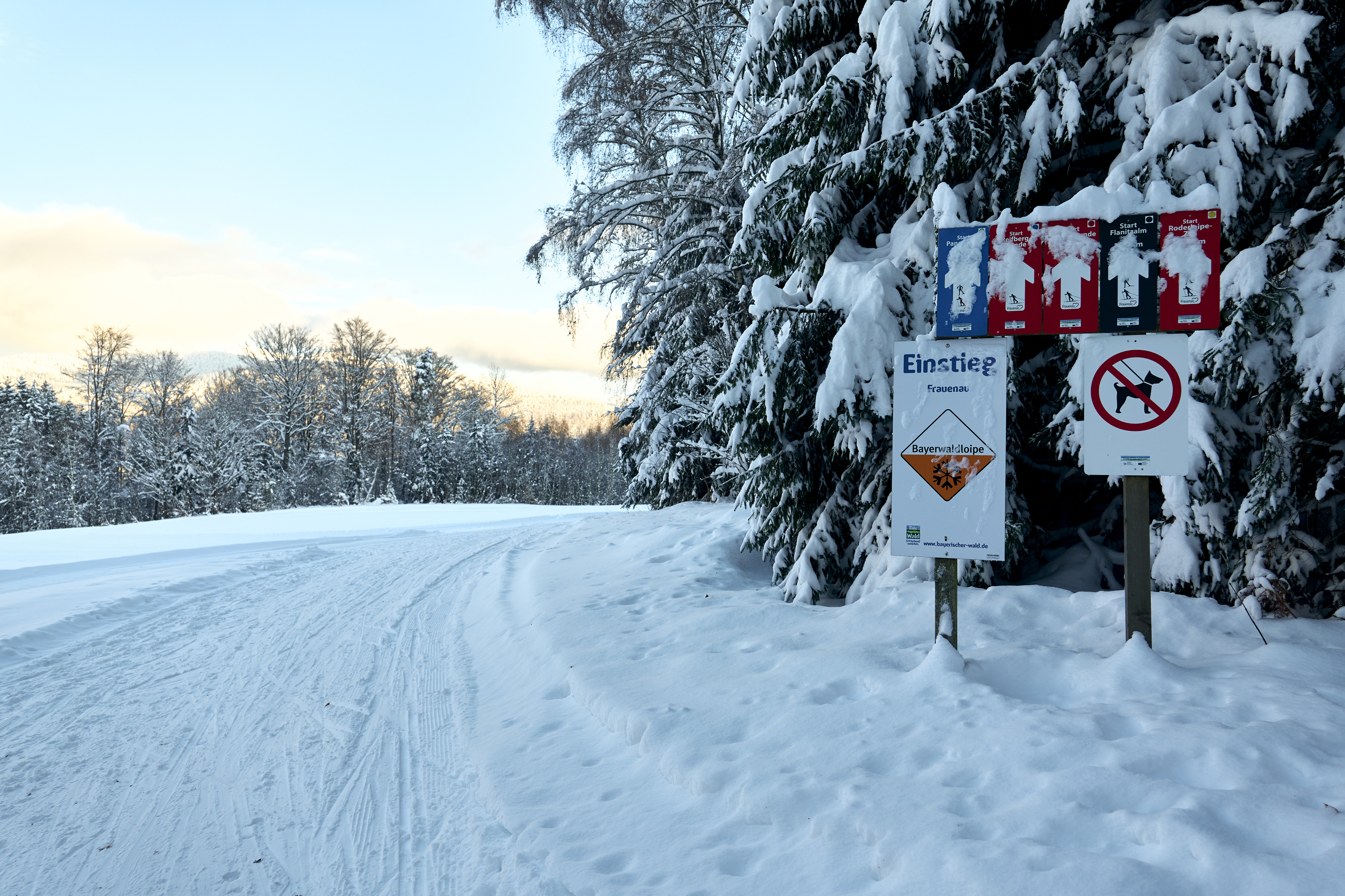 Anreise nach Frauenau mit der Waldbahn. Bei ausreichender Schneelage verkehrt regelmaeßig der Skibus Frauenau zwischen Rathausplatz und Langlaufzentrum Oberlueftenegg. Das Rathaus befindet sich ca. 500 Meter ortsaufwaerts vom Bahnhof entfernt.