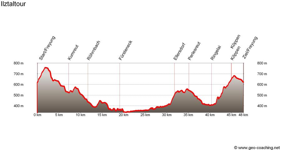 Start und Ziel ist der Parkplatz beim Freibad in Freyung. Los geht’s Richtung Eishalle über den Geyersberg Richtung Marchzipf ( kurze steile Abfahrt auf Wanderweg), Kumreut und weiter nach Röhrnbach, auf Teer- und Schotterwegen. Nach dieser wunderbaren Einrollphase geht’s zur ersten giftigen Abfahrt zur Leopiermühle, (es gibt zwei Optionen, links durch einen Hohlweg, rechts auf dem Wanderweg). Danach geht es entspannt auf Singletrails entlang der Ohe bis zum Ilztalwanderweg(Im Sommer sehr mit Wanderern frequentiert). Dieser führt uns zur Schrottenbaumühle, die bekannt ist für ihren gemütlichen Biergarten( unbedingt Pause einplanen). Es geht weiter auf dem herrlichen Ilztalwanderweg, über die Schneidermühle, bis nach Ellersdorf. Von dort aus geht es Richtung Perlesreut und auf Asphalt über Ringelai zurück nach Freyung.