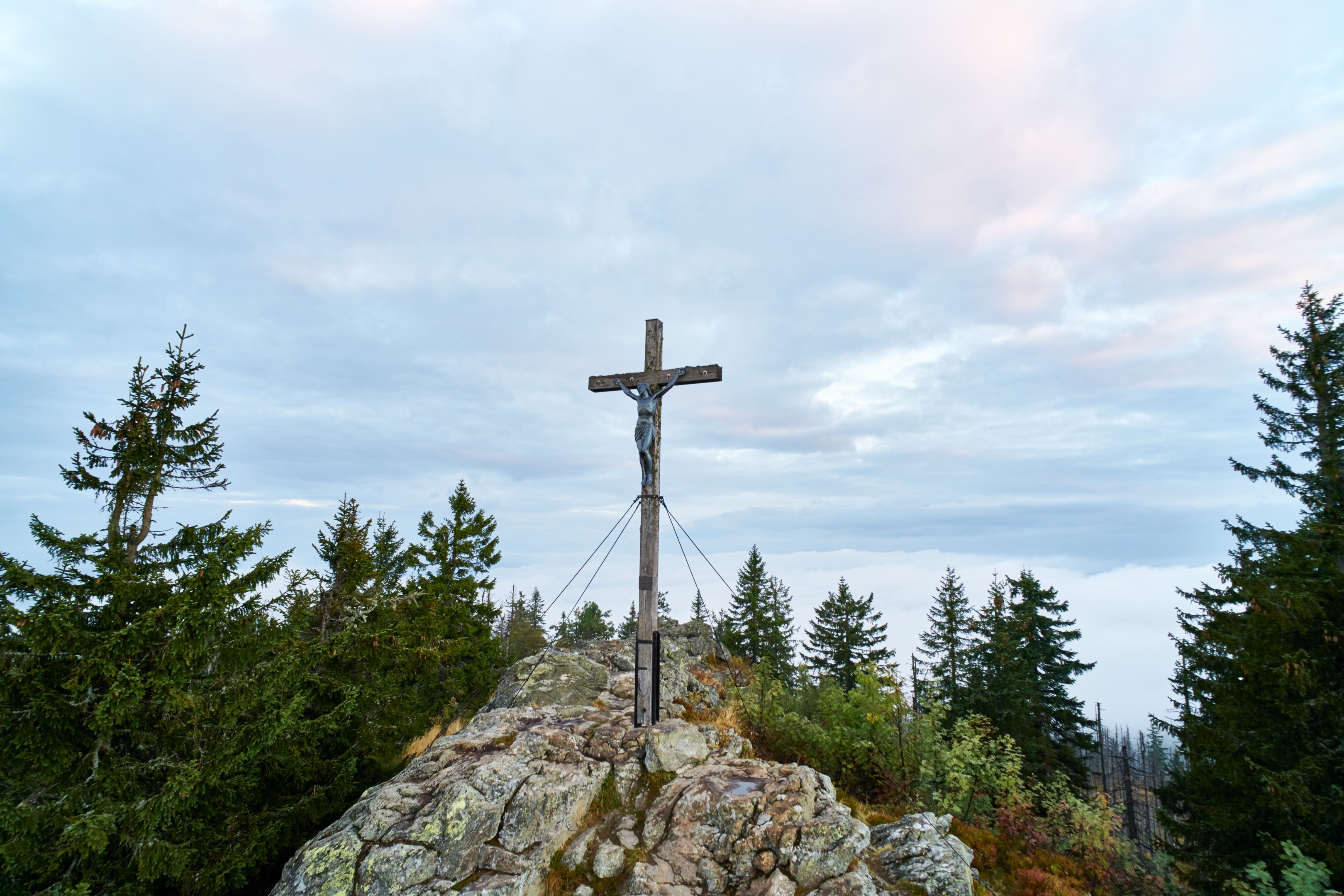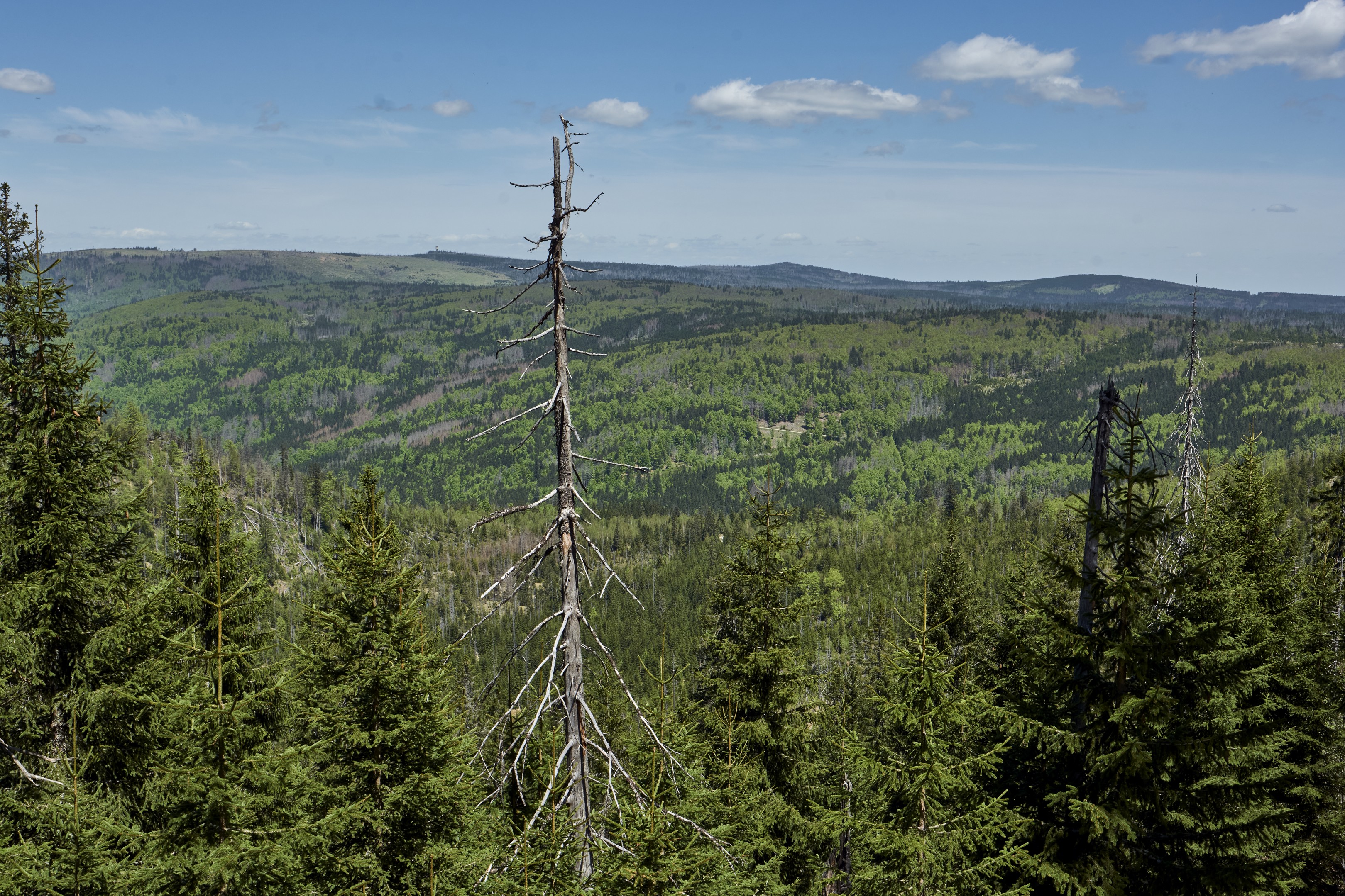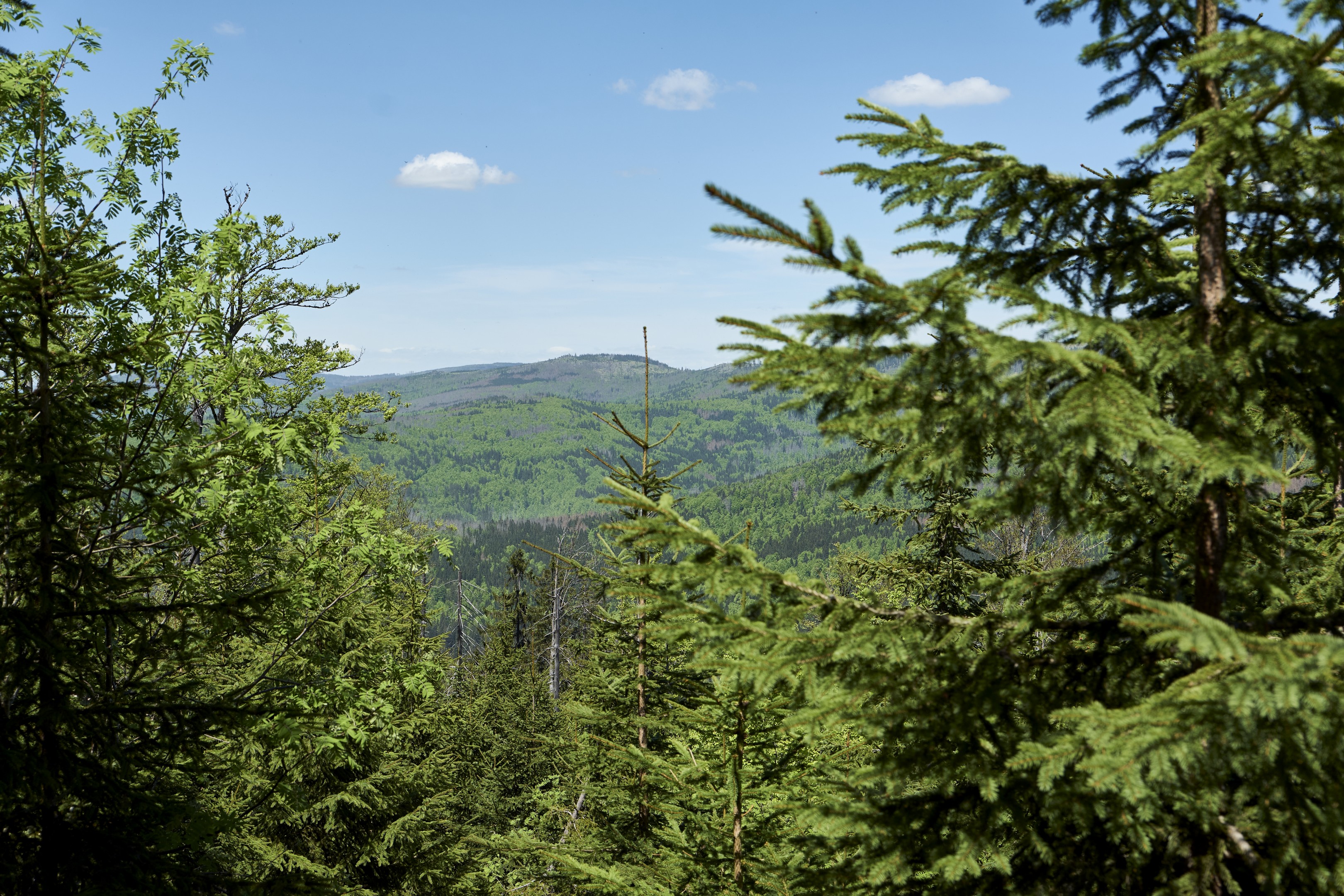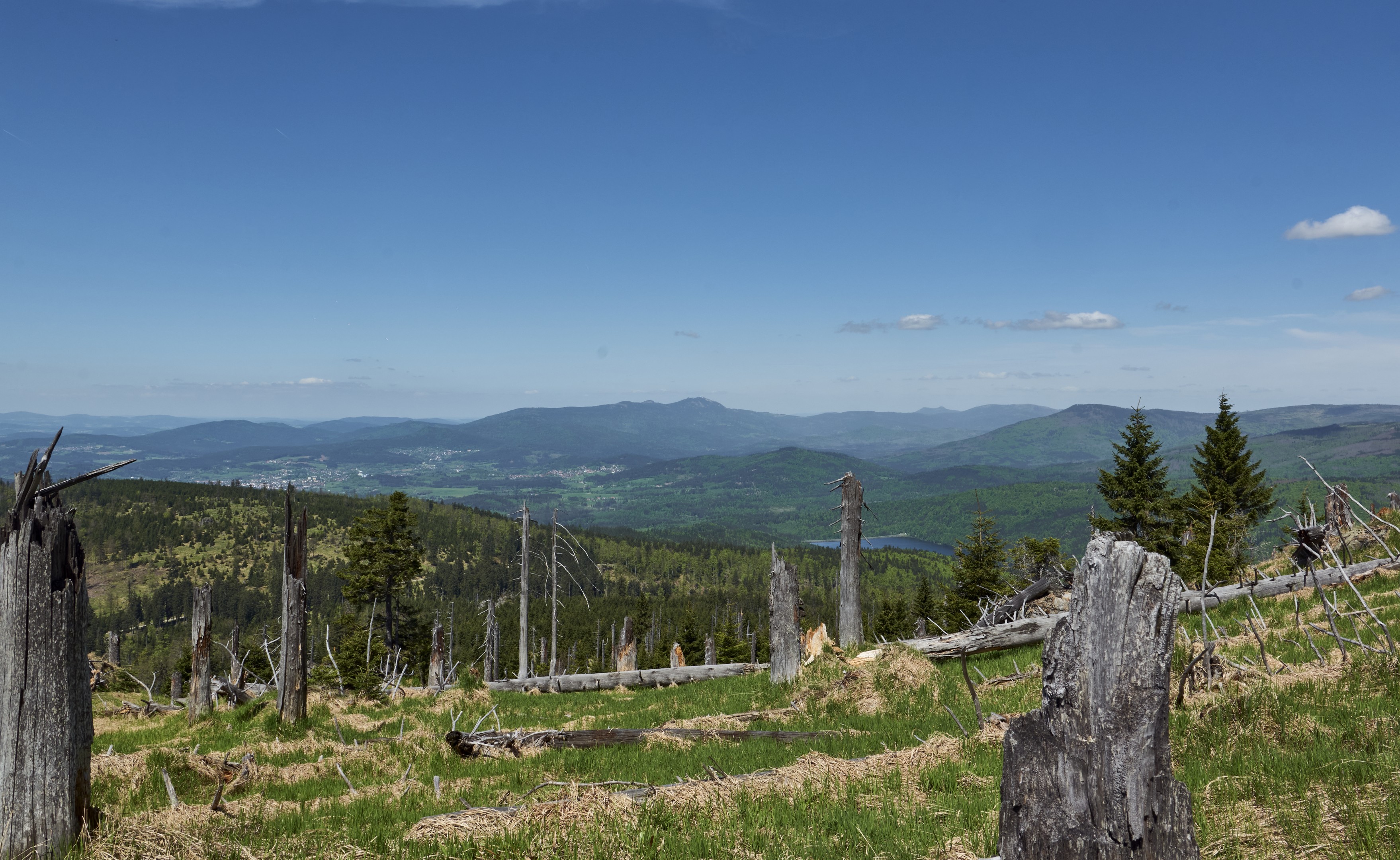 Gleich darauf erreicht man den Gipfel des Großen Rachel. Von hier bietet sich eine herrliche Aussicht über die Bayerwaldberge, den Böhmischen Wald und bei klarem Wetter sogar bis in die Alpen.