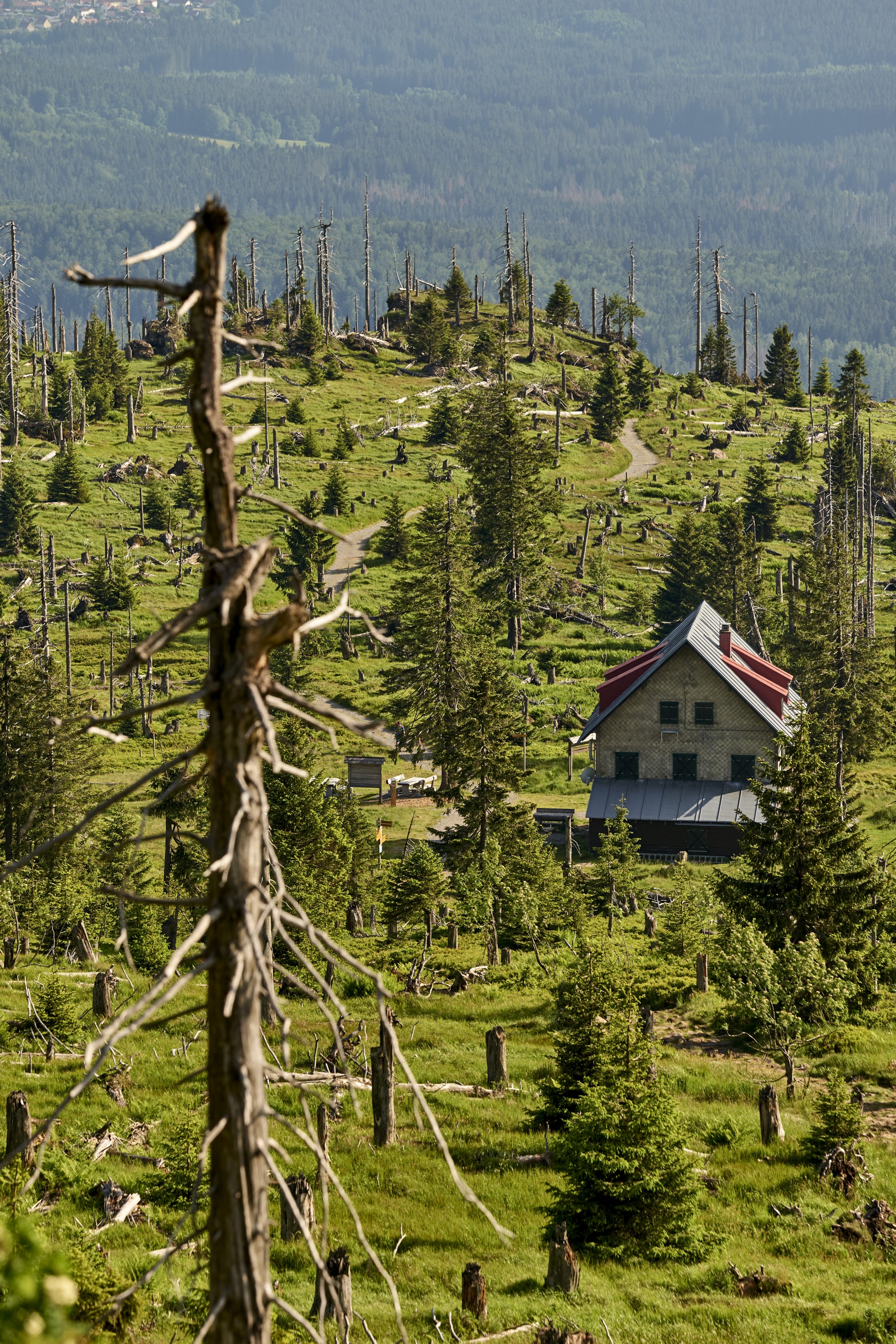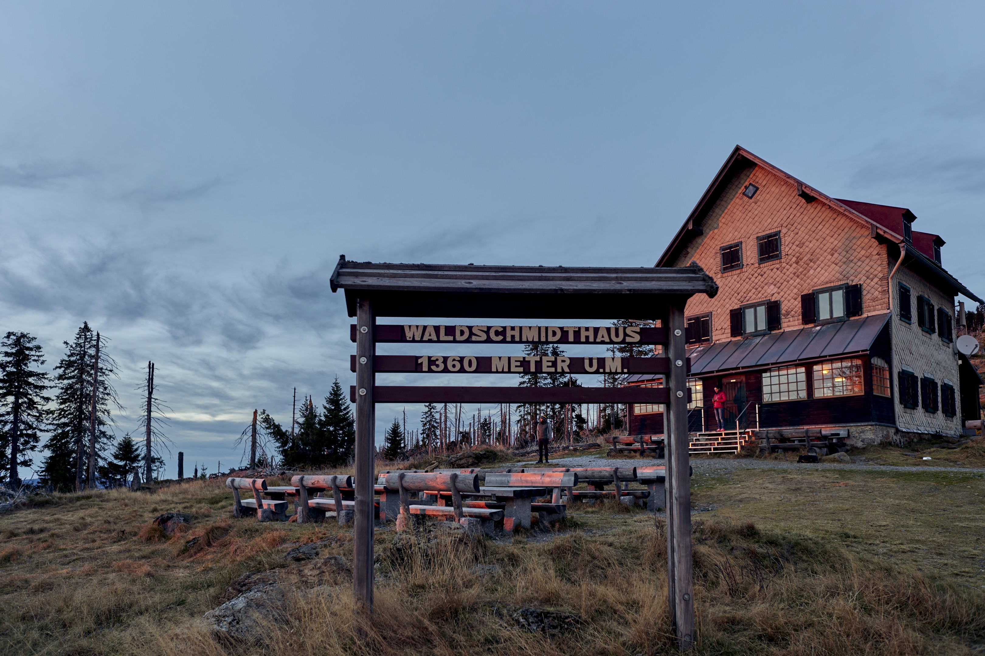 Schließlich gelangt man zur Rachelwiese auf 1360 m Höhe - die höchstgelegene Schachten im Bayerischen Wald. Auf ebenem Gelände gelangt man zum Waldschmidt-Haus. (Derzeit nicht bewirtschaftet) Hier ist ein kleiner Abstecher zu einer Aussichtskanzel möglich, von wo sich ein Blick auf den sagenumwobenen Rachelsee bietet.
