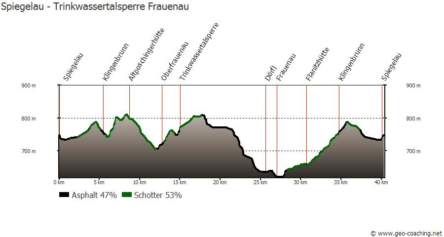 Kurz und treffend beschrieben: Genuss pur in imposanter Landschaft! Ohne große Anforderungen an das Fahrkönnen und die Kondition können wir uns auf dieser Tour vollends der Schönheiten der Landschaft und der Wälder entlang der Strecke erfreuen. Vom P+R Parkplatz in Spiegelau fahren wir bergab bis wir nach 100 Meter an der Querstraße nach links einbiegen (nach rechts geht's zum Bahnhof!). Gemütlich und eben radeln wir an der Naturkneippanlage und dem Aufichtenwaldsteig vorbei, obwohl letzterer sehr interessant ist und einen Zwischenstopp schon jetzt rechtfertigen würde. Bis zum Ortsteil Klingenbrunn-Bahnhof durchqueren wir ein Waldgebiet mit mächtigen Baumriesen, die hier in den feuchten Talauen schon seit mehreren Jahrhunderten wachsen. Weiter auf dem Nationalparkradweg steuern wir wiederum ohne größere Höhenunterschiede durch scheinbar endlose Wälder das Areal des Gutshofes Oberfrauenau des Freiherrn von Poschinger an. Hier lohnt sich eine Rast im Gasthof allemal! Zudem bietet das Wildgehege, der Jagdfalkenhof und der Waldlehrpfad genügend Möglichkeiten um hier ein bisschen zu verweilen. Bis zum sprichwörtlichen Höhepunkt der Tour, der Trinkwassertalsperre, liegen nun nur noch knappe 3 km vor uns. Für jeden Radler ein Muss ist die Runde um diesen künstlichen See, der das Trinkwasser für das Deggendorfer Land speichert und den höchsten Natur-Staudamm Deutschlands aufweist. Anschließend können wir uns auf eine rasante Abfahrt zu den Häusern von Dörfl hinunter freuen, wobei wir acht geben müssen, denn eine Schranke versperrt dem öffentlichen Verkehr die Auffahrt - aber eben uns auch die genüssliche durchgehende Abfahrt bis ins Tal. Unten angekommen halten wir uns links in das Glasdorf Frauenau. Auf dem Weg durch die Ortschaft passieren wir Sehenswürdigkeiten, die uns einen Halt nahe legen. Sei es die Glas-Galerie der Familie Eisch, das große, neue Glasmuseum oder die imposante Glas-Arche in einer überdimensionalen Holzhand unbedingt stehen bleiben und schauen! Die Weiterfahrt aus Frauenau ist auf den ersten 2 km etwas nervig, denn wir müssen auf der Hauptstraße bleiben. Aber keine Panik: Die erste Möglichkeit nach links nutzen wir schon wieder zum Weg zurück in die Natur! Und wie schön es hier doch ist: Die Flanitz ist nun unser steter Begleiter an dem Schotterweg in Richtung Klingenbrunn. Wobei wir in Flanitzhütte das Bächlein überqueren und uns in diesem Weiler an der Straße nach links halten. Wir lassen uns weiter vom Gurgeln des Flanitz-Wassers bis nach Klingenbrunn-Bahnhof leiten. Im Winter werden hier mit die niedrigsten Temperaturen in ganz Deutschland gemessen. Zur Radlsaison lädt aber die Sonnenterrasse des Gasthofes zum Sitzen bleiben in dieser Idylle ein. Von hier aus nehmen wir wieder die gleiche Strecke nach Spiegelau wie bei der Hinfahrt. Den mehr oder weniger müden Beinen gönnen wir nochmals eine Verschnaufpause an der Natur-Kneippanlage, die wir uns ja schon beim Start unserer Tour gemerkt haben. Nach knapp 41 km steigen wir am P+R Parkplatz in Spiegelau wieder von unserem Drahtesel und lassen die wunderschönen Eindrücke dieser Tour - in Gedanken - und mit Blick auf den Rachel vor uns, nochmals Revue passieren.