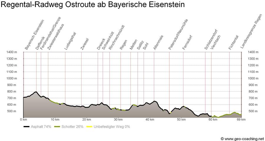 Der Regentalradweg führt uns auf einer leichten, familiengeeigneten Strecke von deutsch-tschechischen Grenze in Bayerisch Eisenstein am Großen und Schwarzen Regen sowie auf Bahntrassen entlang über Zwiesel, Regen, Patersdorf und Viechtach zur Landkreisgrenze Regen/Cham bei Krailing. Zwischen Bayerisch Eisenstein und Ludwigsthal können wir uns zwischen einer Westroute und einer Ostroute, welche uns die ersten fünf Kilometer durch tschechisches Gebiet führt, entscheiden.