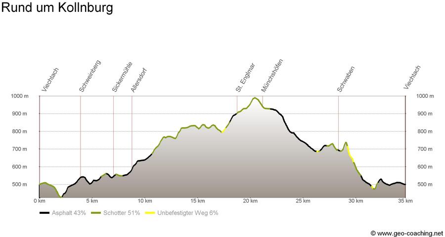 Die Tour beginnt im Uhrzeigersinn am Parkplatz an der Kirchaitnacher Straße in Viechtach. Auf einem flachen Schotterweg radeln wir zunächst nach Eging. Nach einem kurzen, steilen Anstieg können wir uns anschließend auf flachen Wegen durch kleinere Ortschaften bis Allersdorf erholen, bevor die nächste steilere Auffahrt bevorsteht. Hauptsächlich auf Forststraßen und durch Wald radeln wir über St. Englmar zum höchsten Punkt der Tour beim Pröller. Auf einem flachen Forstweg können wir uns anschließend von den Strapazen der Auffahrt erholen. Bei Hinterwies zweigen wir rechts auf den 12-er Wanderweg Richtung Ramersdorf ab. Nach einem längeren asphaltierten Stück wechseln sich ab Schwaben wieder Schotter- und Asphaltwege mit schwierigen Trailstrecken bis Riedmühle ab. Dann geht die Tour wieder zurück zum Startpunkt in Viechtach.