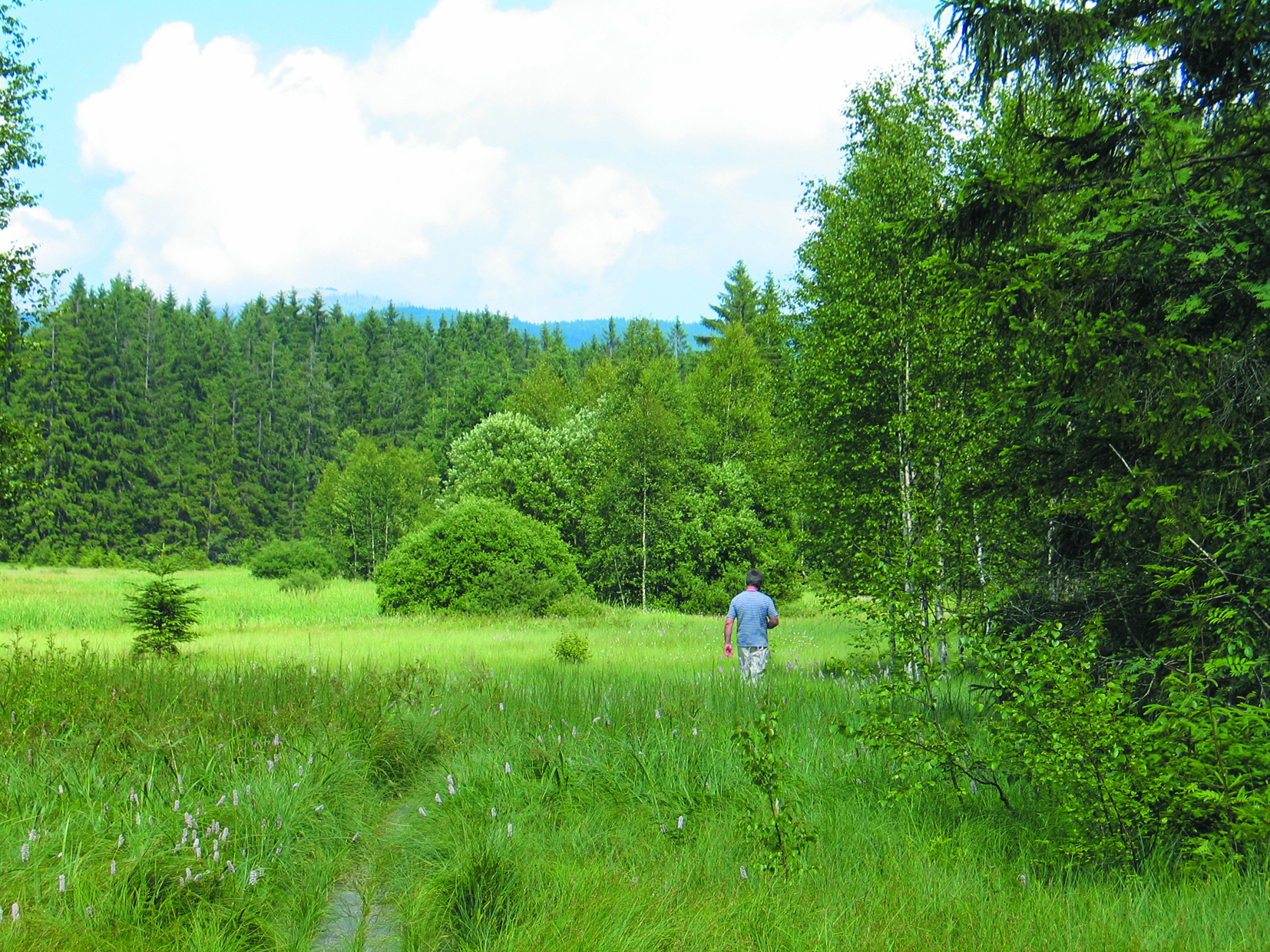 Der Wanderweg 'Kreuzotter' ermöglicht spannende Einblicke in die bizarre Landschaft eines Hochmoors.Vom Waldstadion führt der Weg leicht bergan bis zum Waldrand. Von dort geht es auf einem Forstweg durch ein „Bibergebiet“ in Richtung Nationalparkstraße. Kurz vor der Straße biegst du nach rechts auf den Nationalparkradweg. Von dort aus gelangt man über eine Streckenführung nach rechts auf den Bohlensteg durch das „Große Filz“/den „Filzwald“, der einen durch ein selten gewordenes Biotop führt, mit niedrigem, typischen Kieferbewuchs.Am Ende trifft man wieder rechtsfolgend auf den Nationalparkradweg. Von diesem gelangt man durch Überquerung der Nationalparkstraße vorbei am Parkplatz Diensthüttenstraße, leicht bergan steigend zum idyllischen Weiler Guglöd.