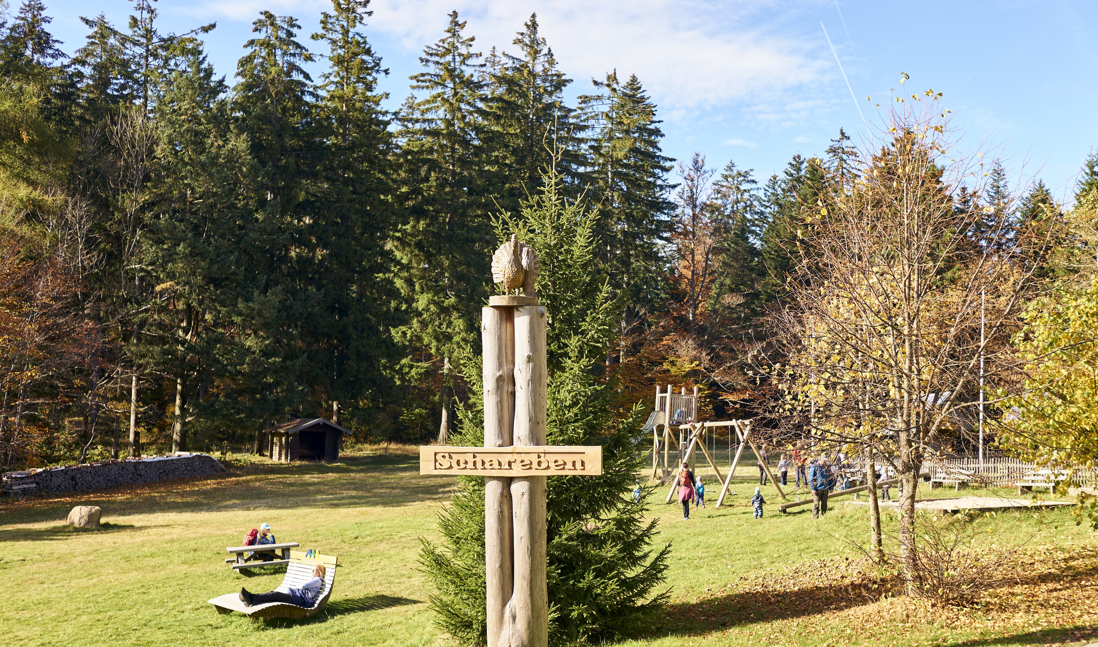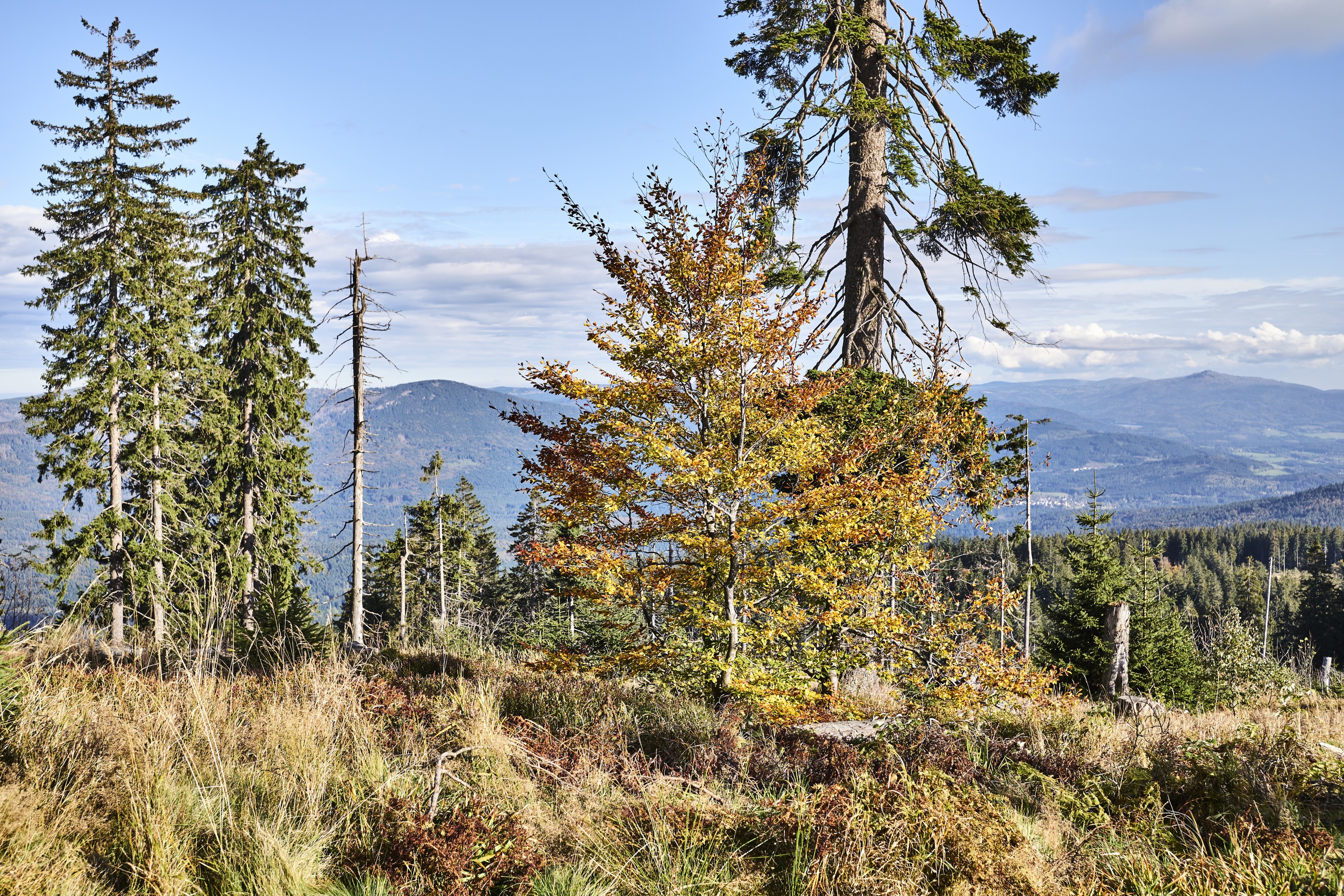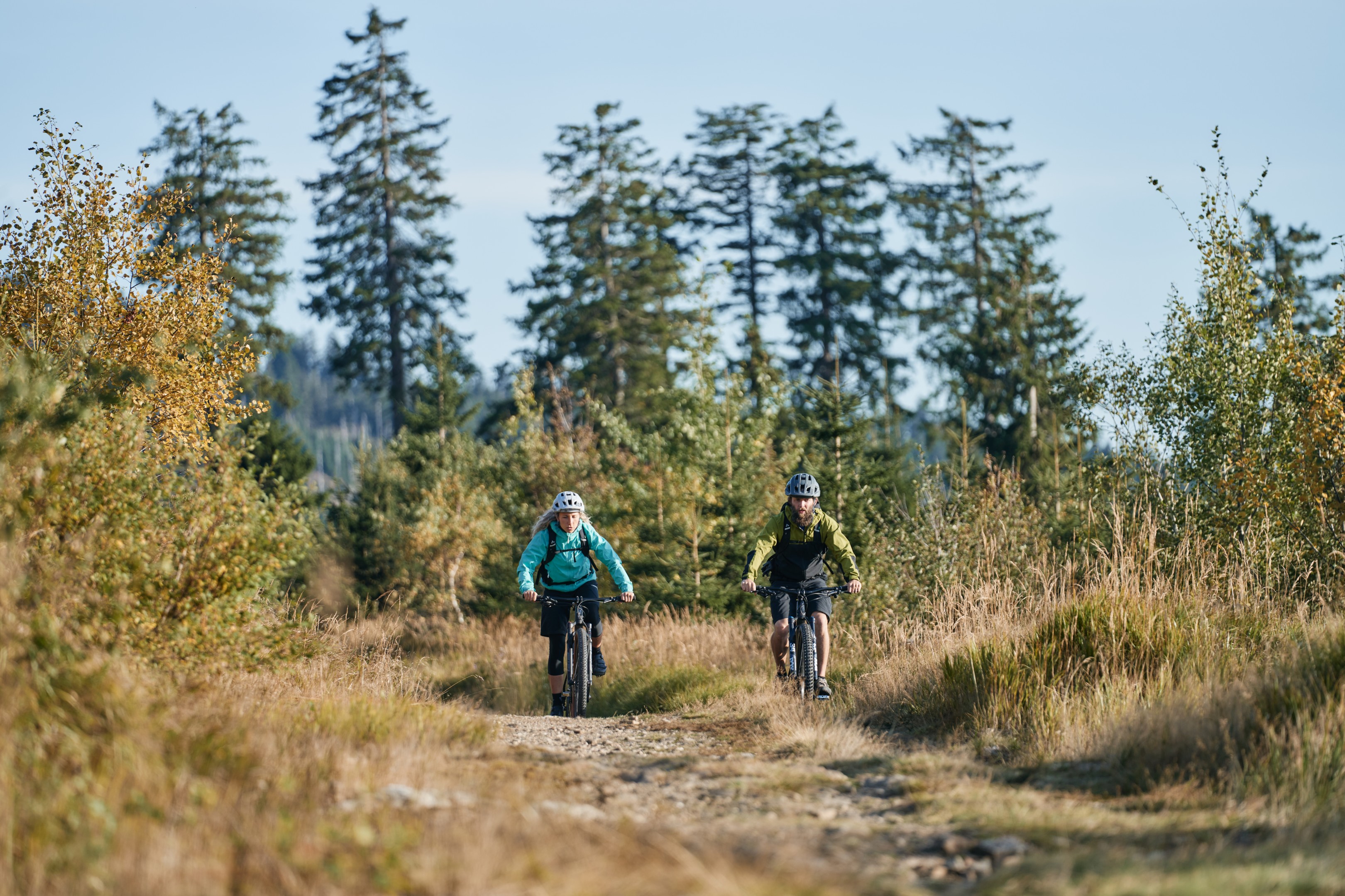 Der lange, stetige Anstieg Richtung Hennenkobel verläuft überwiegend im Wald. An der Wegespinne (Anstieg zum Hennenkobel) fährt man links auf einer schmalen Teerstraße bergwärts Richtung Schachtenbach. Links abbiegend auf eine Forststraße, umfährt man die Rote Höhe (1.048 m) und erreicht das Aktivzentrum Bodenmais am Bretterschachten (1.120 m). Die Arberseestraße überqueren und auf der Forststraße weiter aufwärts zur Auerhahnstraße fahren. Dieser Streckenabschnitt bietet eine herrliche Aussicht über den Bayerischen Wald sowie zum Großen und Kleinen Arber. Die Wanderwege zum Großen und Kleinen Arber kreuzen und man erreicht den höchsten Punkt der Tour (1.257 m). Von nun an geht es bergab über Luchsplatzl und Fuchsenreiben zum Tausender (1.000 m).