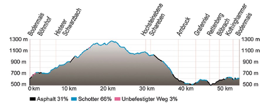 Nach einem leichten Anstieg vorbei am Hochstein (1.134 m) gelangt man zur Schareben (Einkehrmöglichkeit im Berghütte). Auf der Arnbrucker Straße fährt man über Hollerhäng, Kühberg und Riedelbach in den Ort Arnbruck (Einkehrmöglichkeiten). Weiter über Exenbach, Trautmannsried am Röhrbach nach Grafenried.