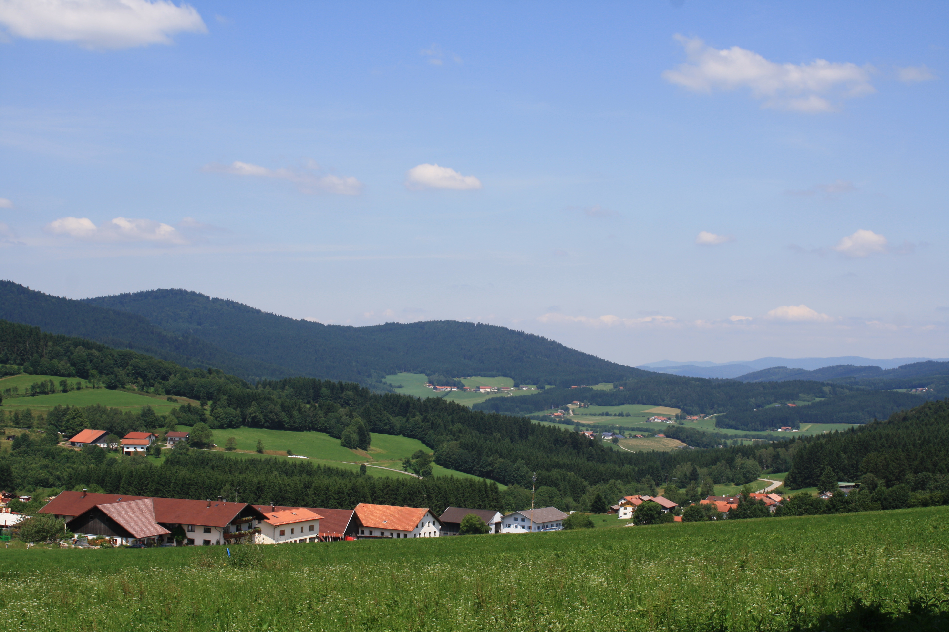 An der Wandertafel in der Ortsmitte von Gotteszell wenden wir uns nach rechts, verlassen den Ortskern und gehen die Straße entlang bis zur Bushaltestelle am Batzerhang. Wir wandern bergauf bis Spirkhof, überqueren die Fahrbahn und folgen dem Weg vorbei an Wiesen und Feldern. In der Kurve führt er uns nach rechts, dann durch den Wald direkt an der Nothelferkappelle vorbei bis zur Straße und wieder rechts zum Gießhübl. Wir folgen der Route bis Tafertsried, biegen gleich rechts ab – die Straße hoch und erfreuen uns an historischen Bauernhäusern. Ein ausblicksreicher Wiesenweg führt uns bergab, durch den Bergwald bis zur Kreisstraße, die wir sofort wieder nach rechts über den Bach und vorbei am weißen Marterl verlassen. Das Eisenkreuz am Wegrand erinnert an das Schicksal eines Mönches, der bei der Rettung des Klosterschatzes von den plündernden Schweden erschlagen wurde. Noch ein kurzes Stück und der Wald gibt den Blick frei auf die umliegenden Dörfer. Über den Wiesenweg erreichen wir die Teerstraße und folgen dieser am Wildgehege vorbei bis Gotteszell.