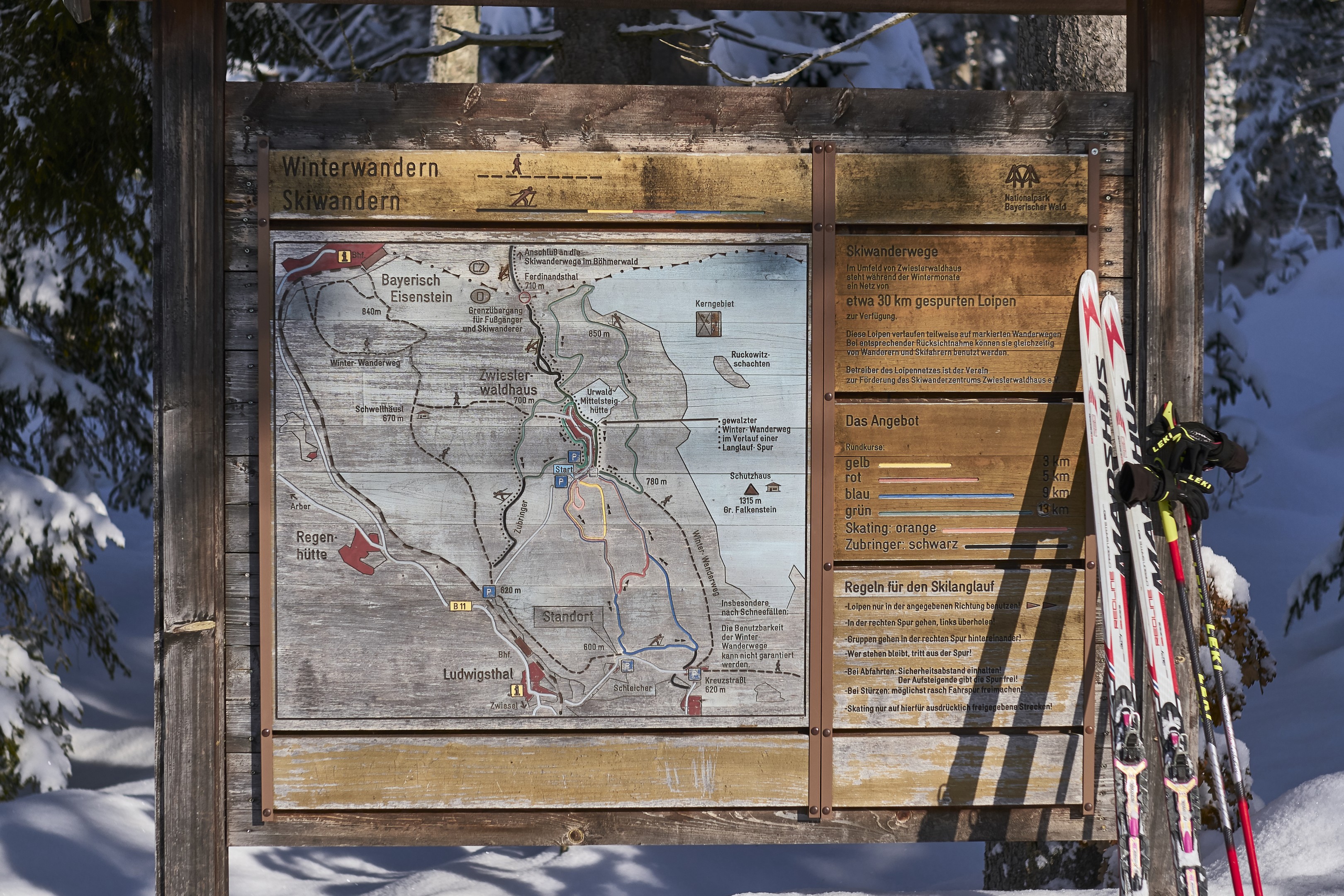 Einstieg gegenüber Start- und Zielgelände -rechts neben der "Zwieslerwaldhaus Alm" beginnen - dem Loipenpfeil "grün" folgen - am Ortsende (Hotel Naturpark) links abbiegen - sie laufen auf einer Forststraße wellenförmig bis zum Grenzübergang Ferdinandsthal. Von dort haben Sie Anbindung an das Loipennetz unserer Nachbargemeinde Zelezna Ruda. Bitte Ausweispapiere mitführen.