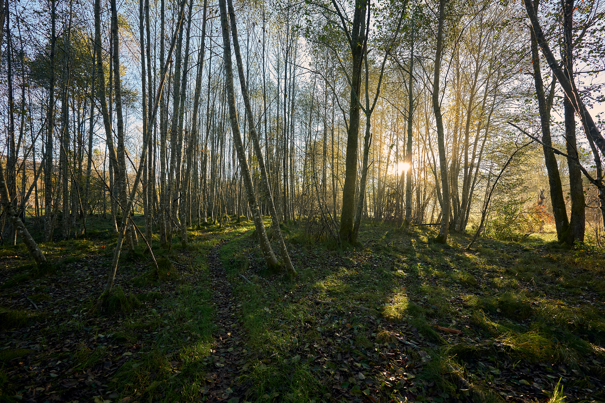 Um den Felsen herum steigt man auf dem Waldweg steil bergab bis zur nächsten Forststraße, in die man nach rechts abbiegt und die zurück zum Festplatz am Regen führt.