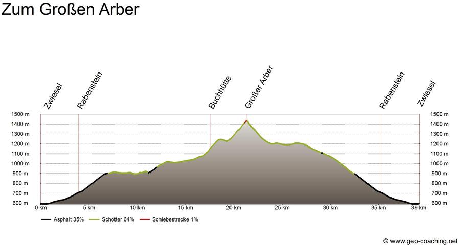 Tourenstart ist in Zwiesel am Bahnhof. Den Ort Richtung Nordwesten verlassen und über Klautzenbach bis Rabenstein radeln. Stetig bergauf geht es über die Kiesstraße, die Arberseestraße und die Arberhochstraße, an der Buchhütte vorbei, bis zum Gipfel des Großen Arbers. Der Rückweg führt bergab über Bretterschachten zurück nach Rabenstein und schließlich zum Ausgangspunkt in Zwiesel.