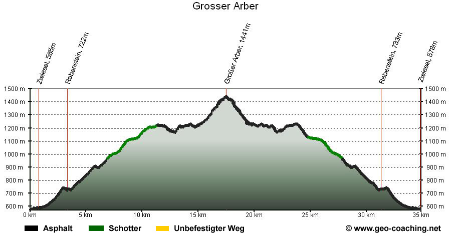 Start der Tour ist Zwiesel in der Nähe des Freibads. Wir radeln nach Klautzenbach und weiter in Richtung Rabenstein. Durch die Ortschaft Rabenstein in Richtung Bodenmaiser Str. weiter zum Hennenkobel. Vor dem Quarzbruch biegt man rechts zum Bretterschachten ab. Die Arberseestrasse erreichen wir an der Grashöhe. Wir überqueren die Arberseestrasse und radeln weiter auf der Auerhahnstraße zum Arberschachten. Hier die erste Straße rechts zum Großer Arber radeln. Das Ziel liegt auf einer Höhe von 1456m. Von hier aus hat man einen fantastischen Blick über den gesamten Bayerischen Wald. Bei schönem Wetter sind die Alpen zu sehen. Zurück geht es auf dem gleichen Weg. Kurz vor der Arberseestrasse gibt es zwei Möglichkeiten die Fahrt zurück nach Zwiesel zu gestalten.
